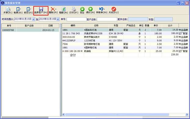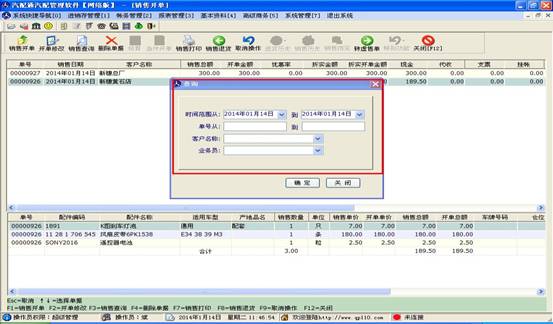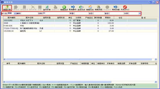 窗口分為上下兩部分,上部分顯示的是開出的單子及客戶一些信息,下部分對應(yīng)的是此單子里包含的配件信息。