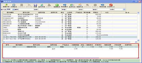 填寫或修正相應(yīng)信息后,點確定此條配件信息將會出現(xiàn)在銷售開單下方的表格里,如下圖。