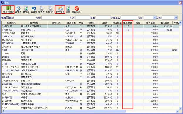 點擊上圖(2.3.1)中的“盤點”按鈕,進入盤點窗口,如下圖(2.3.1.1),初次盤點請點擊“盤點初始化”按鈕,點擊后下放的表格將會列出您所有的庫存。如果某個配件庫存數(shù)量不正確,您可以在“盤點數(shù)量”那列填寫正確的數(shù)量,庫存數(shù)量正確的配件可不填寫。盤點數(shù)量是即時保存的,當您的配件數(shù)量過多時,一天沒有盤完,可以第二天再繼續(xù)盤,但第二天打開盤點是,請不要點擊“盤點初始化”,要不然前一點盤點的數(shù)據(jù)就清空了。當盤點完之后,點擊“啟用盤點”按鈕,庫存數(shù)量將會變成您盤點后的數(shù)量。