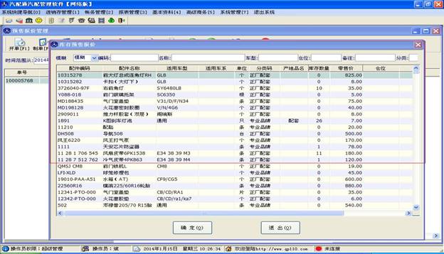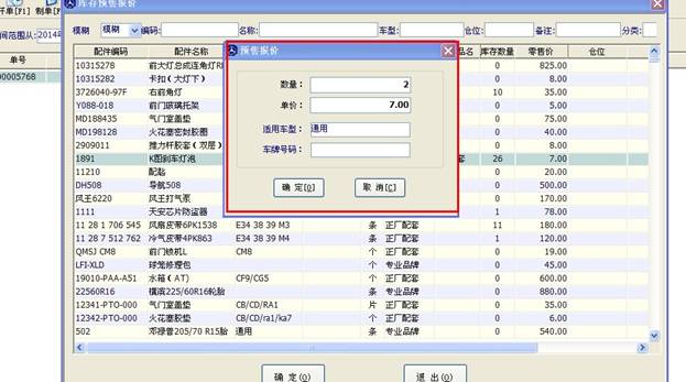 雙擊您需要的配件,在彈出的窗口內(nèi)輸入數(shù)量和單價點確定,這樣就有一個配件進入了您的報價表內(nèi),如果還有更多的配件需要報價,您可以在這里繼續(xù)選擇。當需要的配件都選擇好后,點擊大窗口的“退出”按鈕