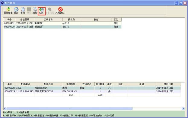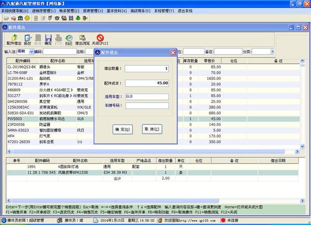 配件借出操作和配件銷售操作差不多,雙擊某條配件,在彈出的框內(nèi)輸入借出數(shù)量等信息,點確定,如果是多個配件借出,可以繼續(xù)上面的操作。