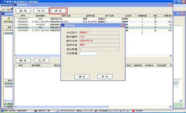 歸還操作和銷售退貨操作差不多,先是使用查詢功能找到您要操作的配件,雙擊后出現(xiàn)歸還窗口,如下圖,輸入數(shù)量后點確定,如果有多個配件歸還還可繼續(xù)操作,之后點保存按鈕完成借出歸還操作。