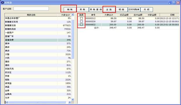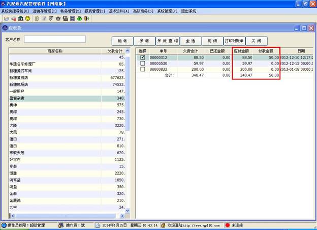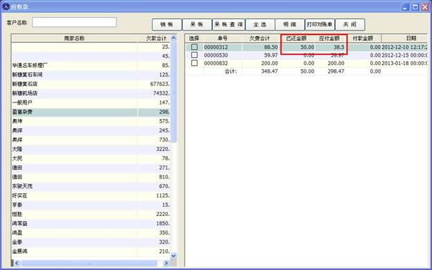 打開應(yīng)收款窗口,如下圖,左邊是商家名稱及欠款合計,當您點擊左邊的某條信息時,右邊的表格會顯示出其應(yīng)付或應(yīng)收的單子列表