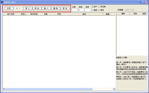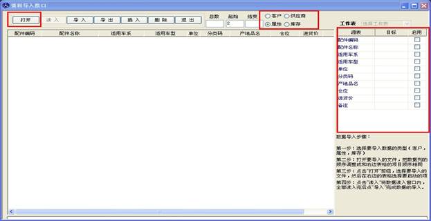 數(shù)據(jù)導(dǎo)入導(dǎo)出可以將您保存在電腦上的excel 文件 導(dǎo)入到軟件里,此窗口支持導(dǎo)入的有客戶資料導(dǎo)入,供應(yīng)商導(dǎo)入,屬性導(dǎo)入和庫存導(dǎo)入,如下圖。四個類型的導(dǎo)入操作都一樣,現(xiàn)在我們以屬性導(dǎo)入為例進行講解。