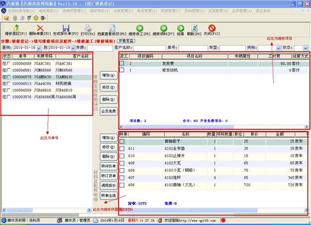 注意,此窗口主要是做進(jìn)廠車輛的登記,登記客戶資料及維修項(xiàng)目和所需配件,在此做了維修項(xiàng)目和所需配件的登記才能做后面的派工及領(lǐng)料操作
