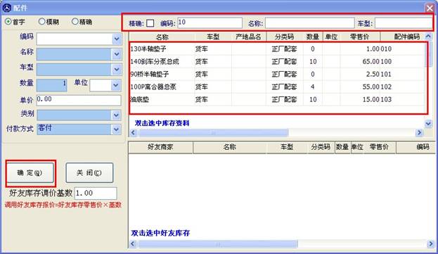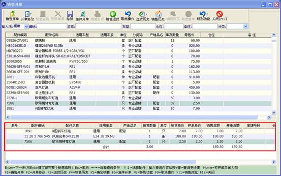 填寫或修正相應(yīng)信息后,點(diǎn)確定此條配件信息將會(huì)出現(xiàn)在銷售開單下方的表格里,如下圖。