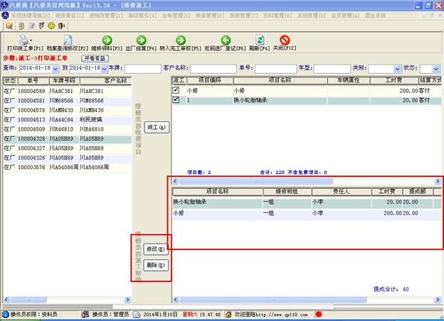 如下圖,紅框中的為派工記錄?梢詫(duì)其進(jìn)行修改和刪除。