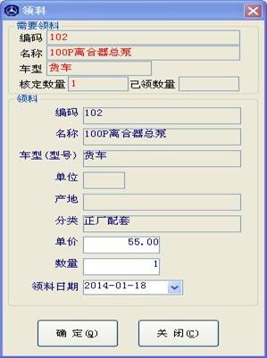 如上圖,中間紅框中的表格為您要領(lǐng)的配件,雙擊某一個(gè)配件后,點(diǎn)擊領(lǐng)料按鈕,進(jìn)入單個(gè)配件領(lǐng)料窗口,如下圖