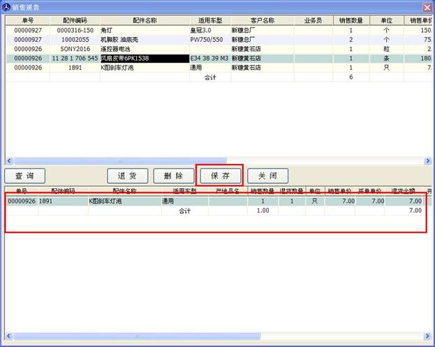 點(diǎn)擊確定后,之前的銷售退貨窗口的下邊表格里就會(huì)出現(xiàn)您要退貨的配件,如下圖。如果您還有要退的配件,可以繼續(xù)以上的操作,如果沒有,請(qǐng)點(diǎn)擊“保存”按鈕進(jìn)入結(jié)算流程