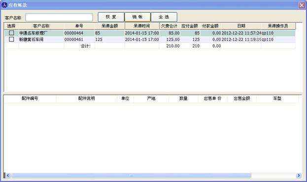 窗口分為上下兩部分,上部分顯示的是開出的單子及客戶一些信息,下部分對(duì)應(yīng)的是此單子里包含的配件信息。