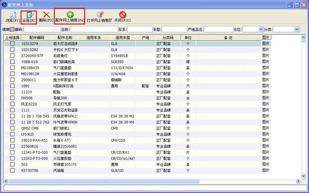 當(dāng)您打開配件網(wǎng)上銷售窗口時(shí) 如下圖,下方的表格會(huì)自動(dòng)幫您讀出您的庫存數(shù)據(jù),您可以點(diǎn)“全選”按鈕選擇所有配件,也可以在下面的表格中勾選您要上傳的配件,選定后點(diǎn)擊“配件網(wǎng)上銷售【F4】”按鈕即可。注意點(diǎn)擊配件網(wǎng)銷售按鈕時(shí)要求在連接到qp110的狀態(tài)下才能進(jìn)行。