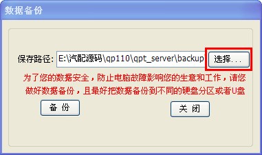 打開數(shù)據(jù)備份窗口如下圖,保存路徑項(xiàng)的默認(rèn)位置上您軟件安裝目錄下的“backup”文件夾,如果您要修改備份目錄,可以點(diǎn)擊后面的“選擇”按鈕,選擇您要存放的目錄。選擇好存放目錄后,點(diǎn)擊備份即可。